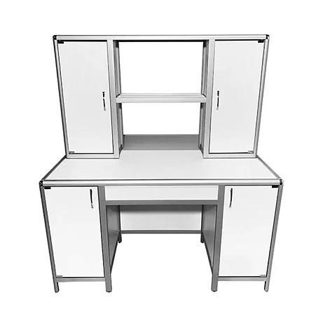 Особенности модели включают каркас из алюминиевого профиля с вертикальными стойками размером 30x30 мм и горизонтальными прогонами размером 33x20 мм, обеспечивающий прочность и устойчивость конструкции. Столешница выполнена из ЛДСП белого цвета с светло-серой кромкой толщиной 16 мм, выдерживающая равномерно распределенную нагрузку до 25 кг.