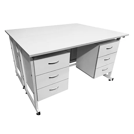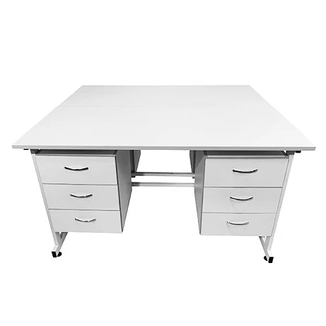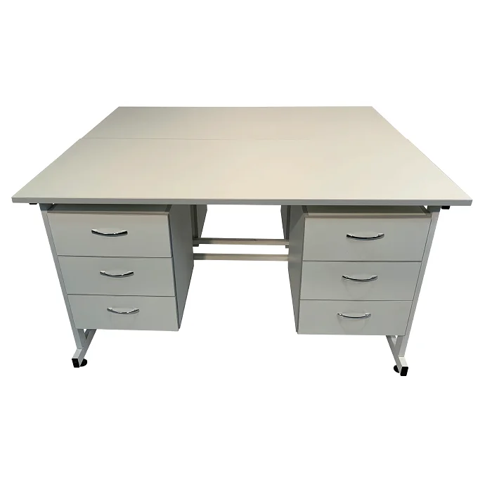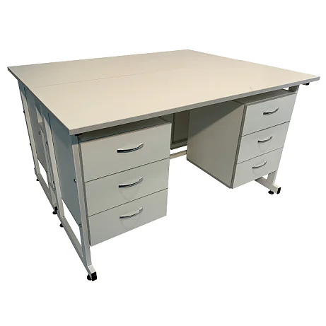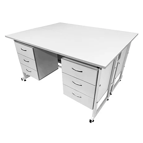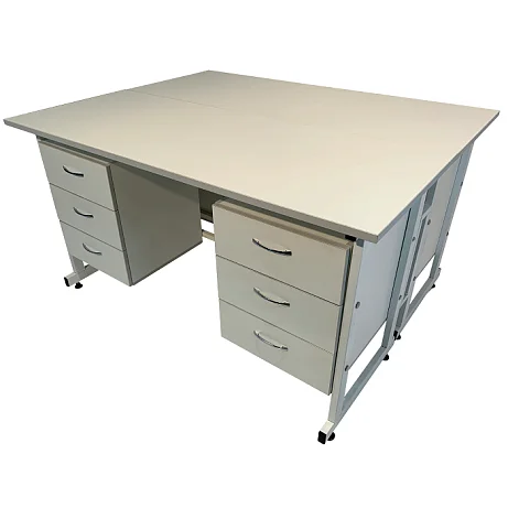 Каркас стола из стального профиля с порошковым белым покрытием обеспечивает надежность и долговечность конструкции. Столешница из ЛДСП толщиной 22 мм имеет общие размеры 1500х1200 мм, состоящие из двух столешниц размером 1500х600 мм, способных выдерживать равномерно распределенную нагрузку до 60 кг на каждую.