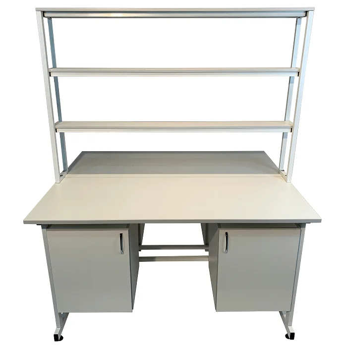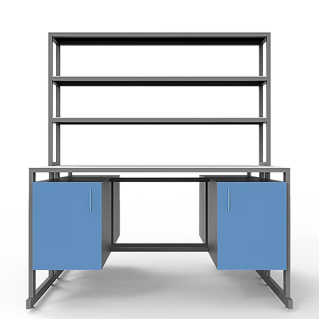 Каждое из рабочих мест оборудовано двумя подвесными тумбами с распашными дверками и внутренними полками для удобного хранения необходимых материалов. Тумбы изготовлены из ЛДСП толщиной 16 мм, размеры внутренней тумбы – 368x444x428 мм. Каждая тумба оборудована одной вкладной полкой размером 365x440x16 мм, способной выдерживать нагрузку до 10 кг. Ручки-скобы тумб выполнены из хромированной стали и имеют размер 96 мм, поставляются в комплекте по 4 штуки.