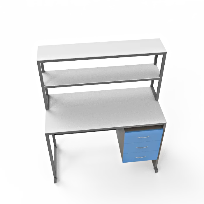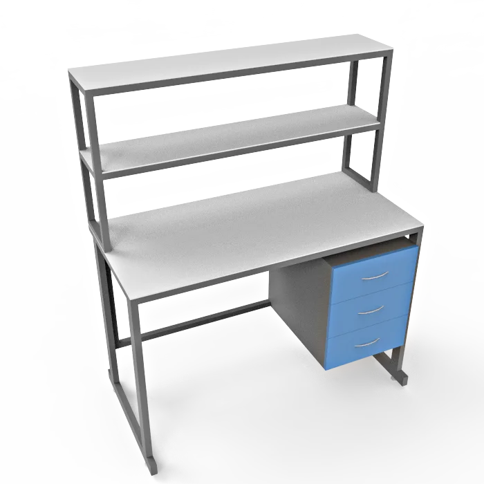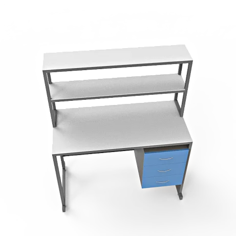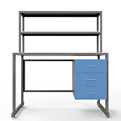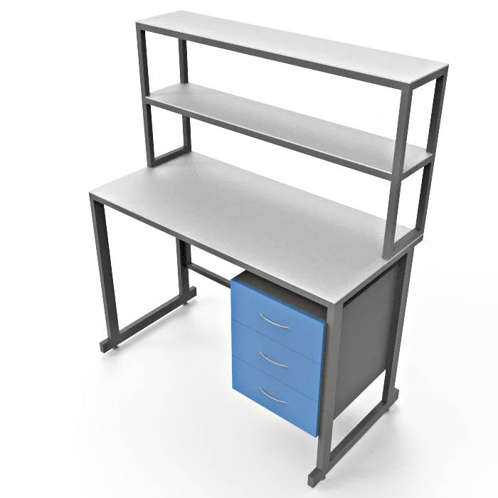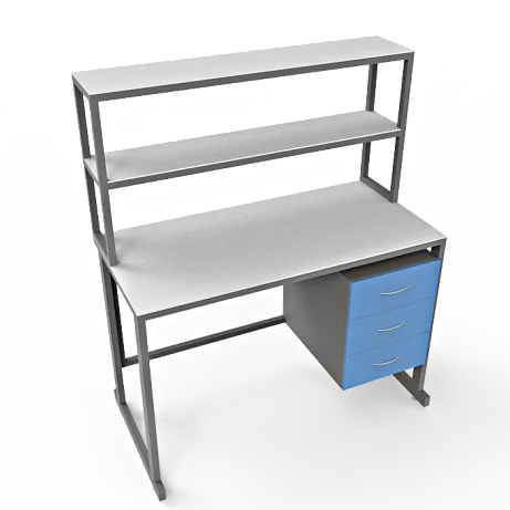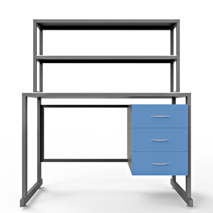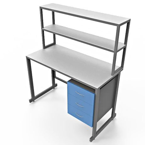 Надстройка стола с двумя полками и тремя выдвижными ящиками под столешницей обеспечивает удобное хранение различных материалов и инструментов, что способствует оптимизации рабочего процесса. Регулируемые по высоте ножки с винтовыми опорами-регуляторами позволяют настроить стол по своим индивидуальным потребностям, обеспечивая максимальный комфорт во время работы. Прочная и устойчивая столешница из керамогранита обладает высокой устойчивостью к химическим веществам, колебаниям температуры и механическим воздействиям, что гарантирует долговечность изделия. Каркас из стального профиля, покрытого порошковой краской, придает столу надежность и прочность.