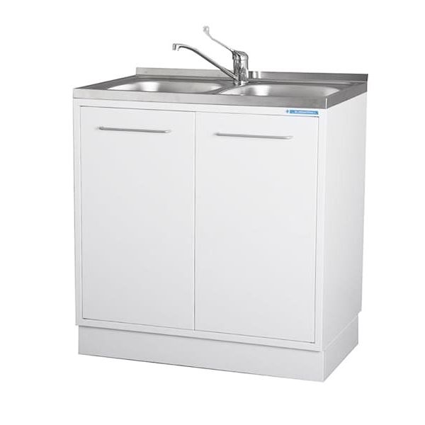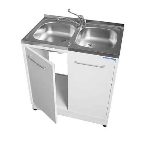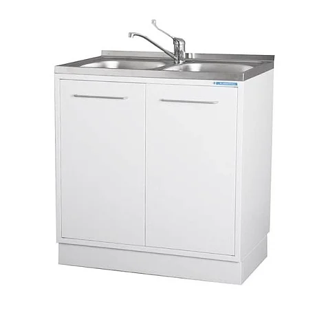 Стол оснащен одним отделением, которое закрывается двумя дверками, обеспечивая удобство хранения необходимых принадлежностей. Верхняя часть стола включает двухчашевую накладную мойку из нержавеющей стали, дополненную локтевым смесителем, расположенным по центру для удобства использования. Установка стола осуществляется на регулируемые опоры, что позволяет выровнять его на неровных поверхностях.