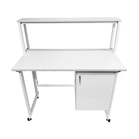 Каркас стола изготовлен из прочного стального профиля 25х50 мм, покрытого порошковой краской белого цвета, что обеспечивает прочность и надежность конструкции. Столешница стола выполнена из ЛДСП толщиной 22 мм, с рабочей поверхностью размером 1200х600 мм, способной выдерживать равномерно распределенную нагрузку до 60 кг.