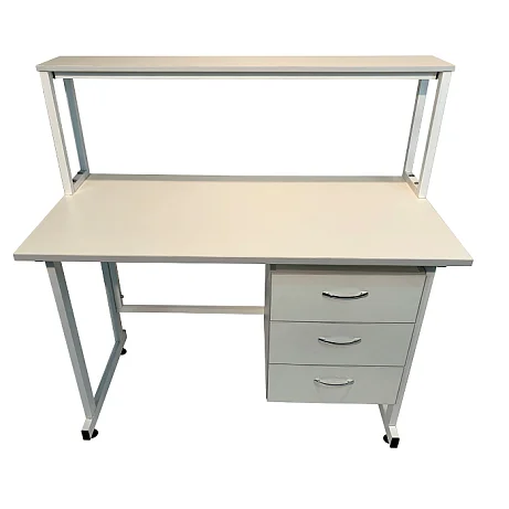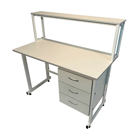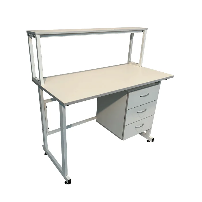 Стол лабораторный с надстройкой СЛн 16.012 очень удобен для проведения разнообразных химических исследований в лабораториях и других медицинских учреждениях. Стальной каркас из профиля 25Х50 мм покрыт порошковой краской и обеспечивает изделию высокую прочность и устойчивость. Материалом для изготовления столешницы служит ЛДСП толщиной 22 мм. Полка надстройки выполнена из ЛДСП (16 мм). Сбоку под столешницей расположена тумба с тремя выдвижными ящиками. На ножках установлены регулируемые по высоте винтовые опоры. Очень заманчивая цена на стол лабораторный с надстройкой СЛн 16.012 предложена в интернет-магазине завода-производителя медицинской мебели «МедМебель». Вся наша продукция проходит проверку на качество, работаем без посредников. Доставка товаров курьером по Москве, в регионы отправляем транспортными компаниями.