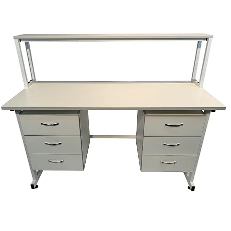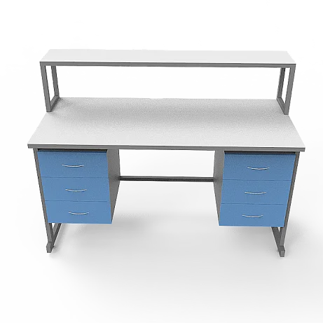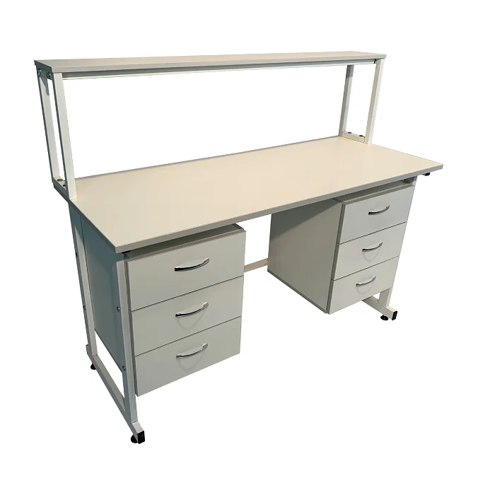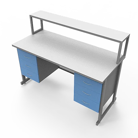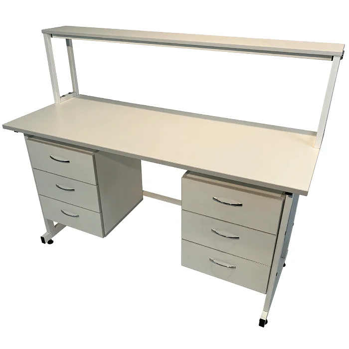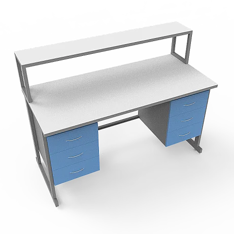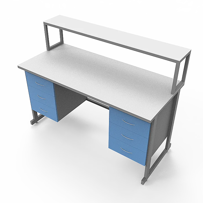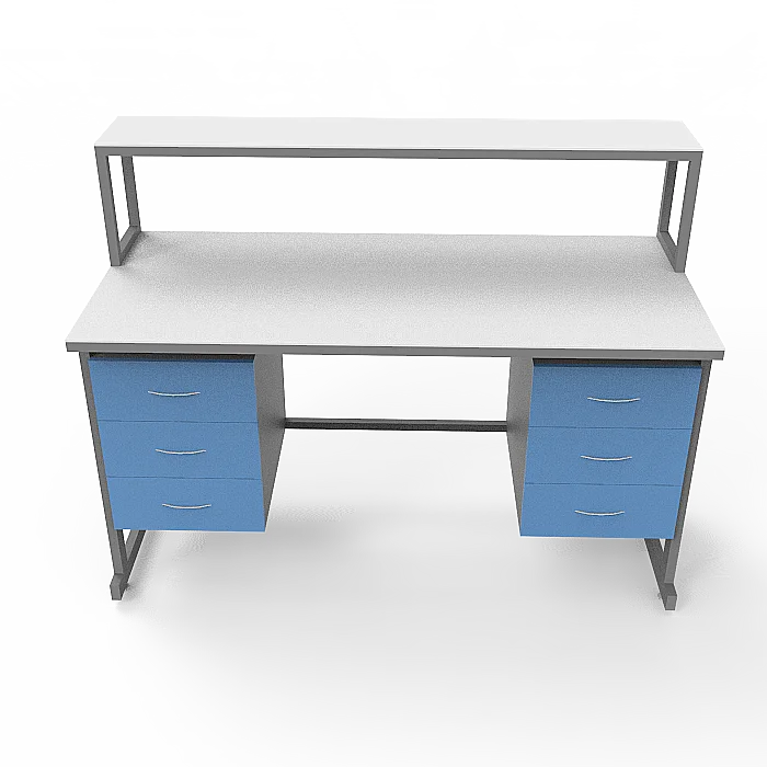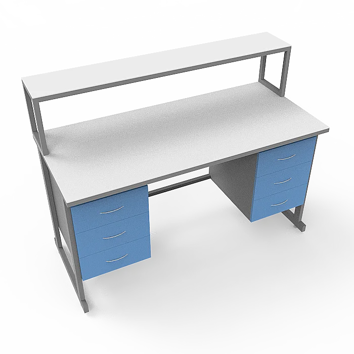 Стол лабораторный с надстройкой СЛн 16.015 устанавливается в медицинских учреждениях и служит местом проведения различных химических исследований. Для изготовления каркаса используется покрытый порошковой краской стальной профиль 25Х50 мм, который обеспечивает конструкции хорошую жесткость и прочность. Столешница изготавливается из ЛДСП (22 мм). Полка надстройки выполнена из ЛДСП (16 мм). По бокам под столешницей расположены тумбы. Каждая тумба оснащена тремя выдвижными ящиками. Ножки могут регулироваться по высоте с помощью винтовых опор. Экономьте на покупке стола лабораторного с надстройкой СЛн 16.015, сделав заказ в интернет-магазине «МедМебель». Мы установили цены от производителя. По Москве работает служба доставки. Возможна отправка товаров в другие города России транспортными компаниями.