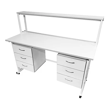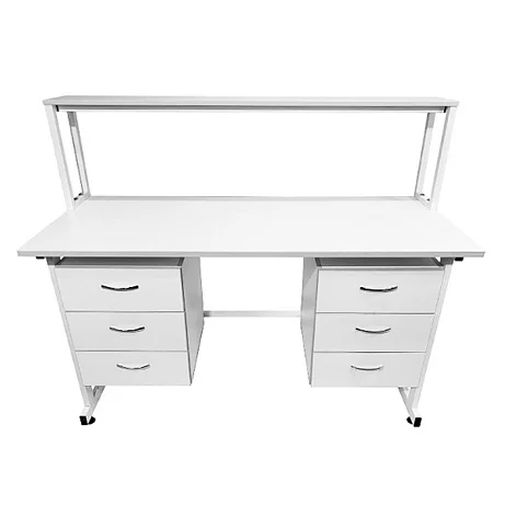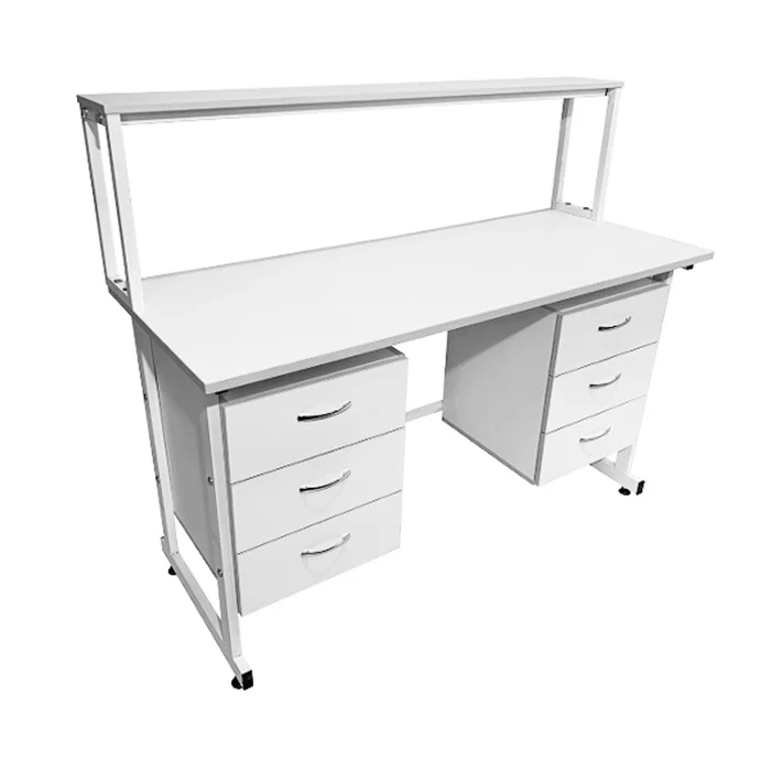 Каркас стола изготовлен из прочного стального профиля размером 25х50 мм с белым порошковым покрытием, что обеспечивает стабильность и надежность всей конструкции. Столешница из ЛДСП толщиной 22 мм имеет достаточно пространства размерами 1500х600 мм, что позволяет комфортно размещать оборудование и материалы с равномерно распределенной нагрузкой до 60 кг.