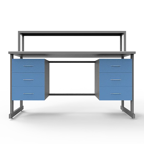 Надстройка стола со встроенной полкой из ЛДСП толщиной 16 мм предоставляет дополнительное пространство для хранения необходимых материалов. Металлический экран обеспечивает дополнительную защиту рабочего места от недопустимых вмешательств.