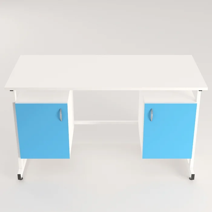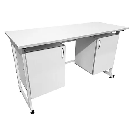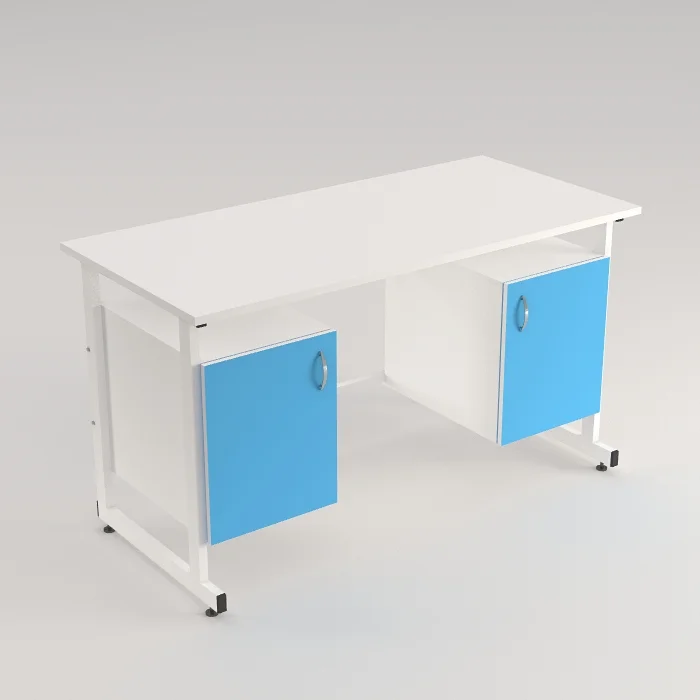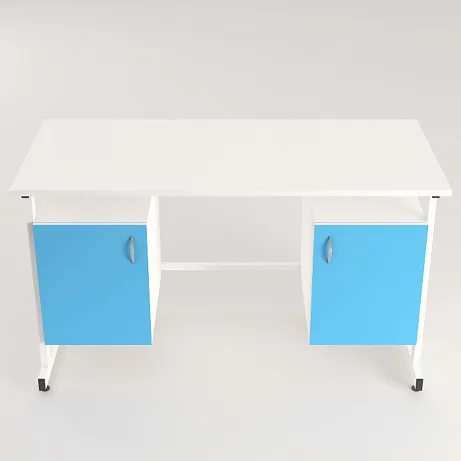 Стол оснащен двумя подвесными тумбами с распашными дверками, выполненными из ЛДСП толщиной 16 мм. В каждой тумбе имеется одна полка вкладная размерами 365х440х16 мм, обеспечивающая удобное хранение необходимых предметов. Тумбы способны выдерживать равномерно распределенную нагрузку на дно и полку до 10 кг. Каждая тумба дополнена стильной ручкой-скобой хромированного цвета длиной 96 мм.