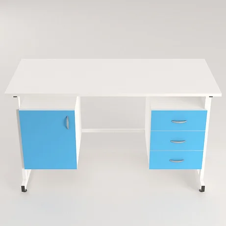 Этот стол оснащен двумя подвесными тумбами - слева находится тумба с тремя выдвижными ящиками, а справа - тумба с распашной дверкой и полкой внутри. Внутренние размеры ящиков и тумб позволяют удобно организовать хранение необходимых инструментов и материалов. Равномерно распределенная нагрузка на дно тумбы, полку и ящики составляет 10 кг, что обеспечивает надежность использования.