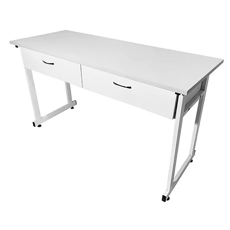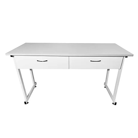 Каркас стола изготовлен из прочного стального профиля 25х50 мм и покрыт порошковой краской белого цвета, что придает ему долговечность и устойчивость. Столешница выполнена из ЛДСП белого цвета с кромкой светло-серого оттенка и имеет толщину 22 мм. Размеры рабочей поверхности составляют 1500х600 мм, с возможностью равномерно распределить нагрузку до 60 кг.