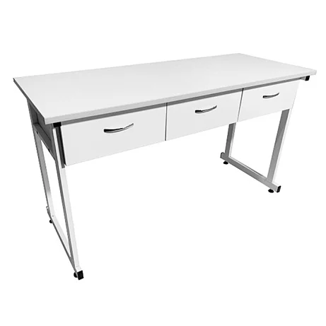 Под столешницей размещаются три вместительных выдвижных ящика с внутренними размерами 418х80х384 мм каждый. Каждый ящик способен выдержать равномерно распределенную нагрузку до 10 кг. Качественные хромированные ручки-скобы длиной 96 мм обеспечивают удобный доступ к содержимому ящиков, облегчая работу с документами и инструментами.