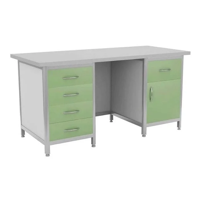 Стол СЛТК-Л-05 для оснащения рабочих мест сотрудников медицинских лабораторий оснащен двумя боковыми опорными тумбами. В одной тумбе размещается четыре выдвижных ящика. Другая тумба имеет один верхний выдвижной ящик и отделение с полкой и распашной дверкой. Алюминиевый каркас обшит ЛДСП. Столешница сделана из ДСП покрытого бумажно-слоистым пластиком. В магазине МедМебель предложена лучшая цена на стол лабораторный СЛТК-Л-05. Для покупки достаточно оформить заказ на сайте. Товар будет доставлен в любую точку Москвы курьером.