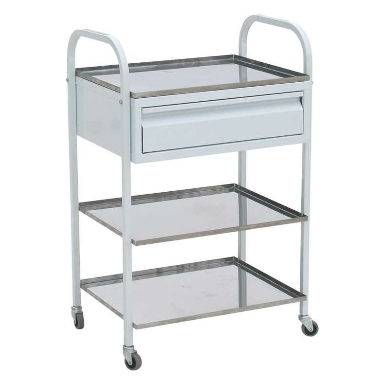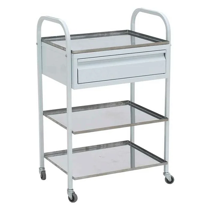 Каркас манипуляционного стола для использования в медицинских учреждениях изготовлен из профильной трубы, окрашенной краской белого цвета. Стол содержит три полки из нержавеющей стали, под верхней полкой находится выдвижной ящик без ручки на телескопических направляющих. Манипуляционный стол предусматривает установку его на колесные опоры. Если вы решили приобрести этот манипуляционный стол, лучше сделать это в Москве в магазине МедМебель, где самые выгодные цены на данный вид мебели и быстрая доставка в оговоренные сроки.