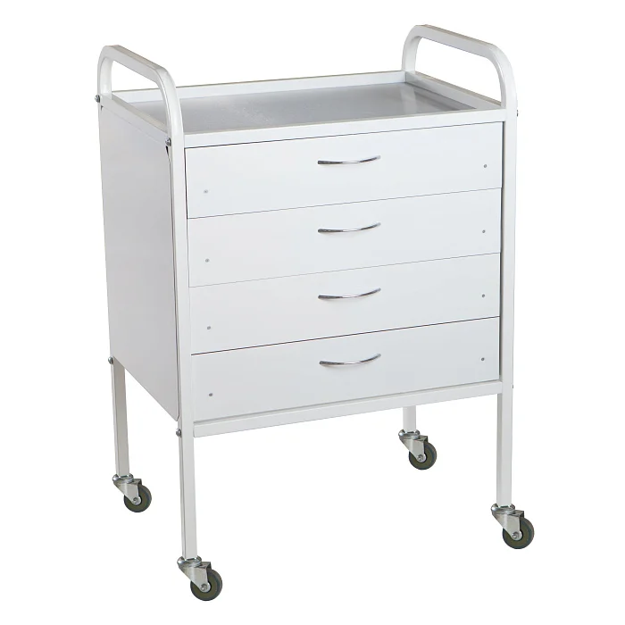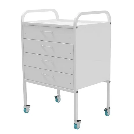 Каркас выполнен из профильной стальной трубы 20х20. Передвижная тумба имеет четыре ящика на опоре. Столик стандартно комплектуется колесами из серой резины диаметром не менее 50мм, два из которых с тормозом. Полки изготовлены из металла. Для крепления ящиков применяются телескопические шариковые направляющие, ручки из хрома. Изделие поставляется в разобранном виде, что позволяет экономить средства при перевозке в другие регионы. 4 ящика позволяют разместить большое количество мелких предметов отдельно друг от друга, а верхняя полка служит для хранения предметов наиболее часто используемых в процессе работы сотрудников медицинского учреждения.