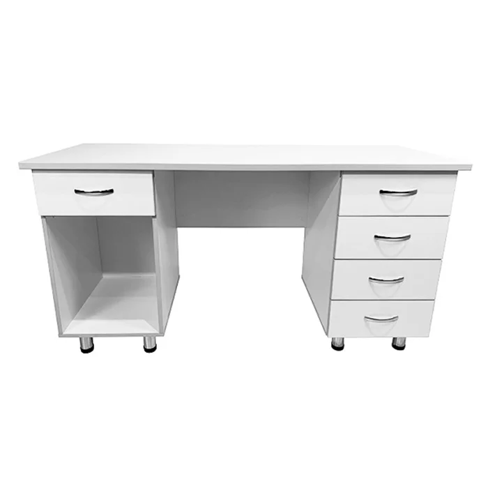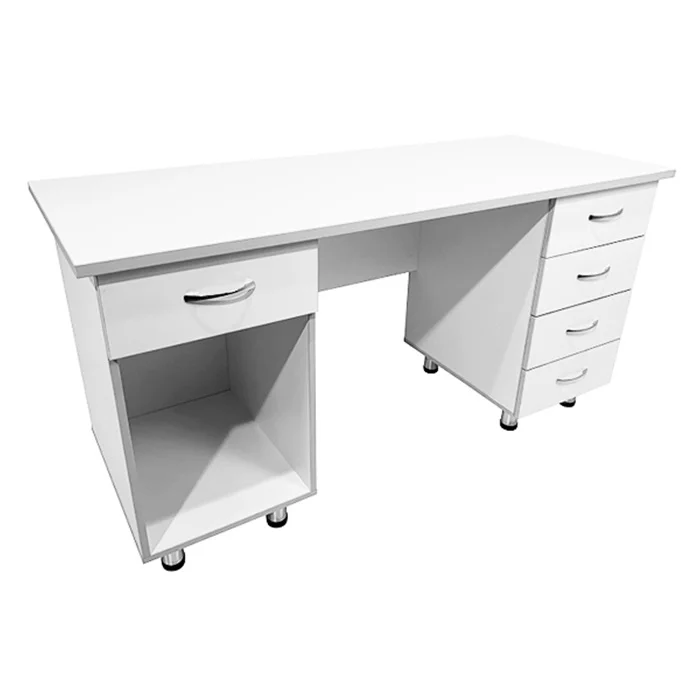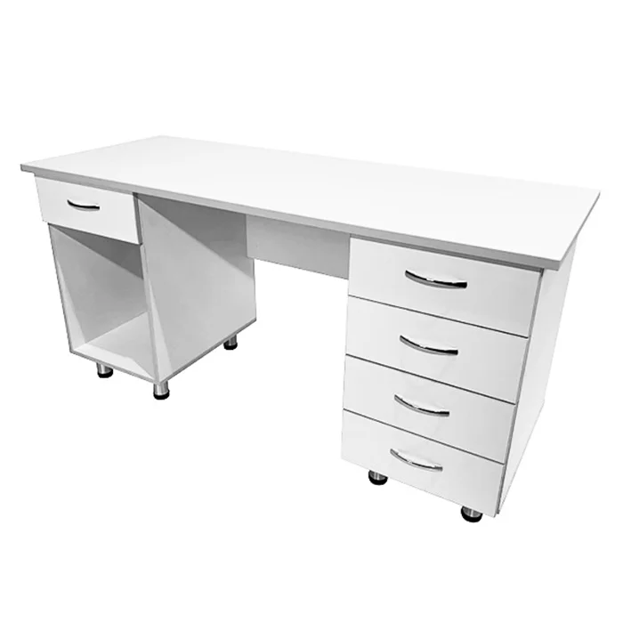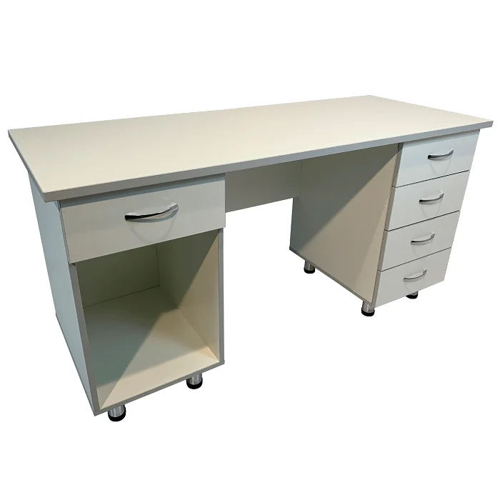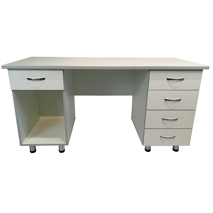 Особенности стола включают в себя две боковые тумбы с различным набором функциональных элементов. Одна из тумб оснащена выдвижным ящиком и нишей, а вторая - четырьмя выдвижными ящиками. Это обеспечивает удобное хранение различных медицинских принадлежностей и инструментов. Дизайн стола выполнен в белом цвете ЛДСП с кромкой светло-серого оттенка, придавая ему элегантный и современный вид.