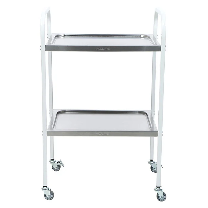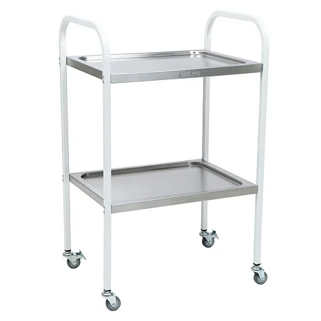 Столик процедурный медицинский МД SP 2N эксплуатируется в процедурных и смотровых кабинетах. Подходит для размещения лекарственных препаратов, инструмента и приборов при проведении профилактических и лечебных мероприятий. Каркас изготовлен из профильной трубы квадратного сечения и окрашен эпоксидно-порошковой краской. Модель оснащена двумя цельнотянутыми полками из нержавеющей стали. Поверхность столика имеет повышенную устойчивость к ударам, сколам, средствам санитарной обработки способом протирания. Для удобства перемещения модель оснащена колесами из серой немаркой резины, не оставляющей следы на полу. Два колеса оборудованы тормозом.
