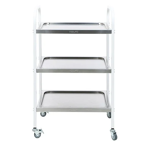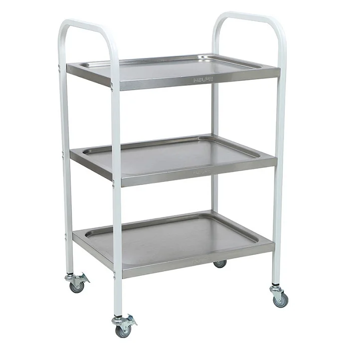 Стол процедурный МД SP 3N — универсальная модель, предназначенная для размещения инструмента, лекарственных препаратов и приборов. Каркас изготовлен из профильной трубы квадратного сечения и окрашен эпоксидно-порошковой краской. Модель укомплектована тремя цельнотянутыми полками из нержавеющей стали. Поверхность столика имеет повышенную устойчивость к ударам, сколам, средствам санитарной обработки способом протирания. Для удобства перемещения модель оснащена колесами из серой немаркой резины, не оставляющей следы на полу. Два колеса оборудованы тормозом.