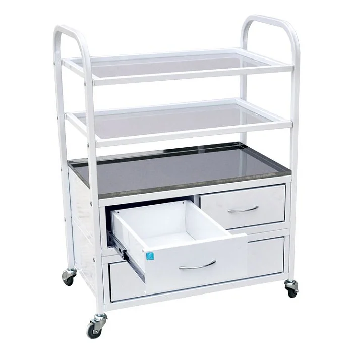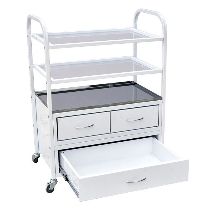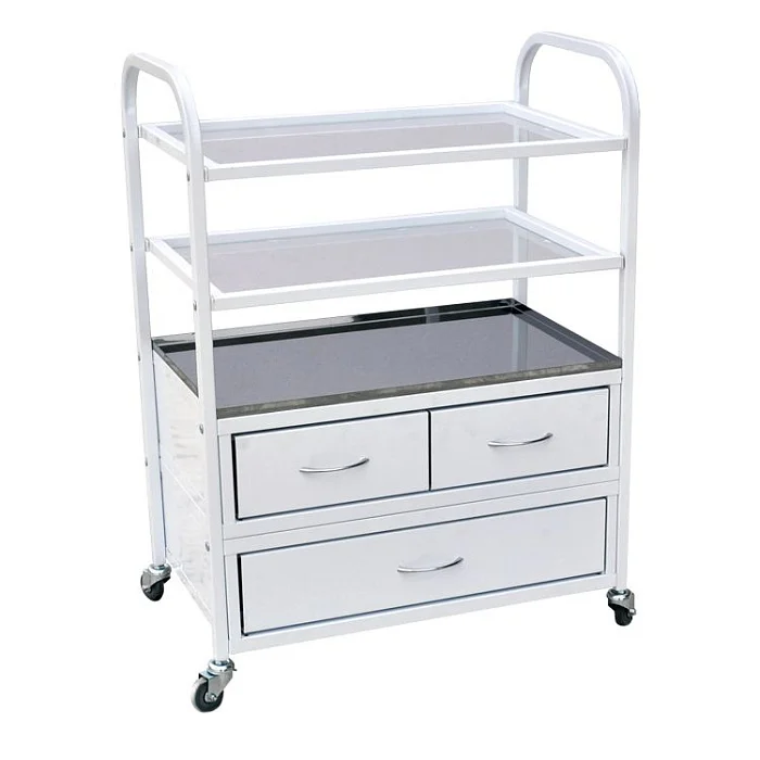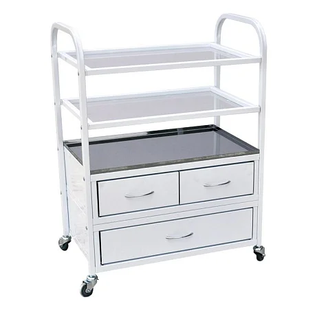 Стол на каркасной основе из профильной трубы. Конструкция предусматривает наличие двух полок и лотка, под которым расположены три ящика с ручками. Выдвинуть их полностью помогут установленные роликовые направляющие. Стандартная комплектация предусматривает стеклянные полки и лоток из нержавеющей стали. Однако по желанию заказчика полки могут быть из нержавейки, а лоток – металлическим. Стол установлен на саморегулирующиеся колесные опоры. Купить такой стол недорого с доставкой можно в специализированном московском магазине МедМебель.