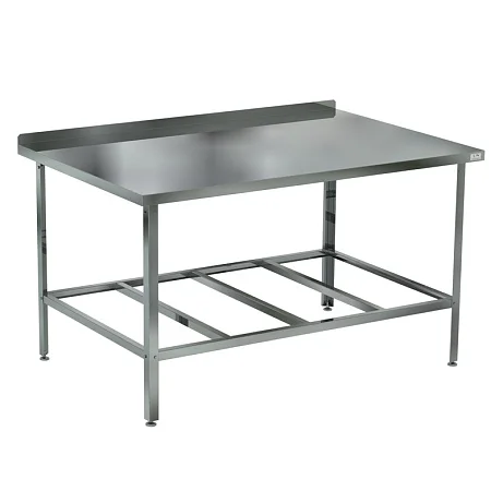 Стол разделочный с бортом СРБ-120/60. Снизу полка-решетка. Стол имеет на столешнице борт высотой 40 мм и предназначен для установки около стены. Борт предохраняет от попадания продуктов питания на стену или пол. Столешница стола изготовлена из нержавеющей стали aisi 430 и усилена с внутренней стороны листом ламинированной древесно-стружечной плитой толщиной 16 мм, что увеличивает прочность и исключает прогиб столешницы. Каркас стола состоит из ножек, выполненных в виде уголка 40х40 мм из оцинкованной стали. Рекомендуемая нагрузка на стол не более 100 кг. Ножки стола имеют регулируемые по высоте опоры, позволяющие устранять неровности пола. Изделия разборные и поставляются в упаковке, что облегчает их транспортировку и хранение. Столы разделочные широко применяются в различных производственных цехах предприятий общественного питания, супермаркетах, комбинатах пищевой промышленности для разделывания и обработки пищевых продуктов, а также в качестве вспомогательной поверхности для кухонного оборудования.