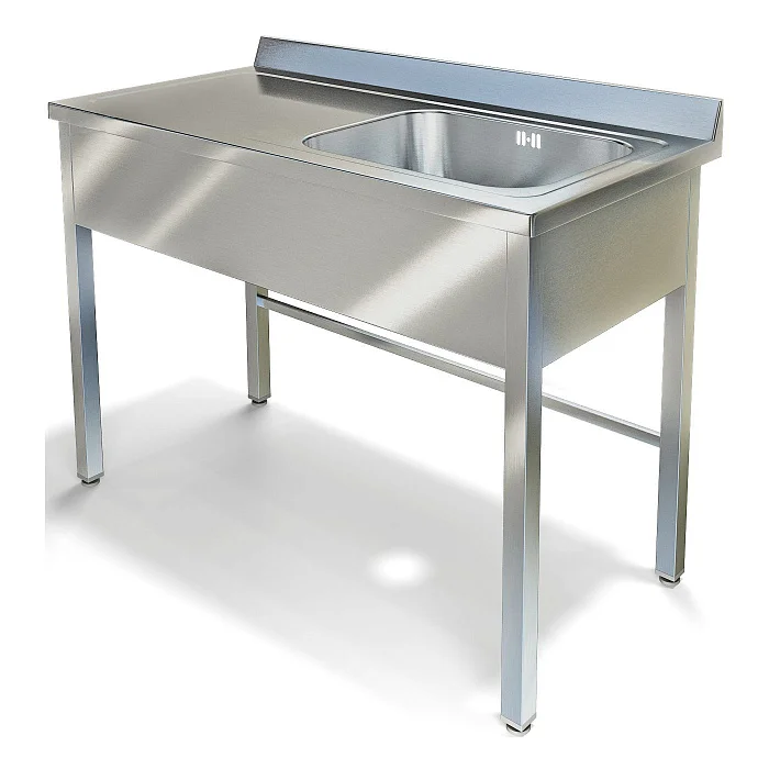 Корпус и ванна — из нержавеющей стали AISI 304: столешница — 1 мм, сварной каркас — профиль 40×40 мм, 1,2 мм. Фартук по трём сторонам выполнен из AISI 430, 0,8 мм. Ножки с регулировкой высоты дают возможность быстро выровнять стол на неровном полу. Поставляется в собранном виде, можно сразу начать работу.