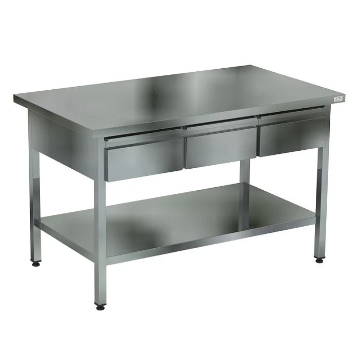 Для удобного хранения кухонного инструмента и комфортной работы хорошо подойдет стол с выдвижными ящиками СПЯ-120/60. Конструкция компактная и вместительная. Внизу сделана сплошная полка, под столешницей предусмотрено три выдвижных ящика. Это позволяет рассортировать и хранить всегда под рукой необходимую кухонную утварь. Конструкция сделана из надежной и прочной нержавеющей стали. Рабочая поверхность достаточно широкая, ножки легко регулируются по высоте, чтобы стол не шатался даже на поверхности с неровностями. Цена и оперативная доставка обеспечат максимальную выгоду приобретения стола в нашем магазине. Прямо сейчас сделать заказ могут покупатели из Москвы или регионов. Возможно изготовление мебели из нержавеющей стали по Вашим чертежам и размерам. Для просчета возможности изготовления изделия, не представленного на сайте, и получения коммерческого предложения, просим обращаться к менеджерам компании по телефону или электронной почте.