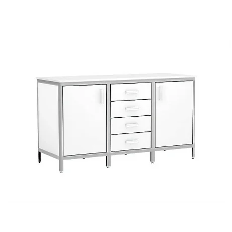 Стол-тумба лабораторный АСК СТ.01.01 разбит на три секции. По бокам размещаются отделения, каждое из которых оснащено полкой и распашной дверкой. Центральное отделение оборудовано четырьмя выдвижными ящиками. Для изготовления столешницы используется односторонне ламинированный МДФ. Материалом для обшивки служит ЛДСП. Каркас изготовлен из алюминиевого профиля. Магазин МедМебель — территория низких цен на всю медицинскую мебель. Сделайте заказ на покупку стола-тумбы лабораторного АСК СТ.01.01 на сайте. Не забудьте воспользоваться услугой доставки по Москве.
