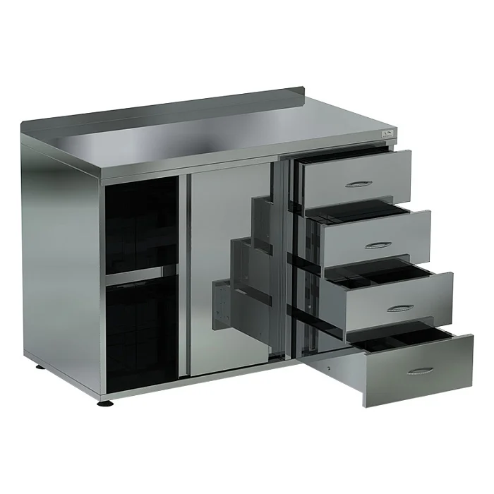 Стол-тумба с бортом СТБ/1-150/70/К совмещает в себе просторную рабочую поверхность и удобное пространство для хранения кухонной утвари. Разместить все, что должно быть под рукой, можно в четырех выдвижных ящиках и на полочках. Отделение с полочками закрывается на раздвижную дверцу. Конструкция предназначена для установки к стене. Бортик на ней предотвращает загрязнение стены и пола частичками пищи. Прямо сейчас вы можете оформить заказ на стол, выбрав для этого удобный себе способ. Наш магазин обеспечит вам оперативную доставку по Москве или в регионы, а также самую доступную цену на стол. Возможно изготовление мебели из нержавеющей стали по Вашим чертежам и размерам. Для просчета возможности изготовления изделия, не представленного на сайте, и получения коммерческого предложения, просим обращаться к менеджерам компании по телефону или электронной почте.