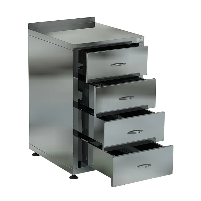 Стол-тумба с бортом СТБ/1-40/60 компактный и функциональный. Его верхняя поверхность — это столешница с бортиком. Он предотвращает попадание частичек пищи на стену или пол около стола. Нижняя часть конструкции — это четыре выдвижных ящика. В них удобно хранить кухонное оборудование, которое используется в работе. Стол стоит на четырех опорах, в каждой из которых высоту регулировать будет удобно. В результате стол будет устойчивым даже в том случае, если стоит он на неровной поверхности. Наш магазин обеспечивает наилучшее сочетание цены и качества на стол. Заказать его с доставкой по Москве или в другие города вы можете прямо сейчас. Возможно изготовление мебели из нержавеющей стали по Вашим чертежам и размерам. Для просчета возможности изготовления изделия, не представленного на сайте, и получения коммерческого предложения, просим обращаться к менеджерам компании по телефону или электронной почте.