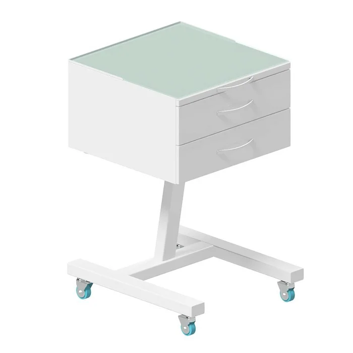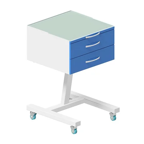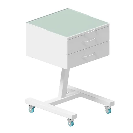Передвижная тумба имеет два ящика на опоре, сверху полка из стекла. Ящики имеют сварную конструкцию, изготовлены из листового металла толщиной не менее 0.8 мм.