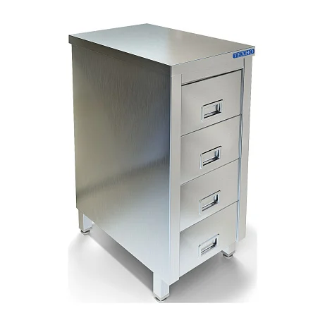 Столешница — комбинация долговечной нержавейки AISI 304 и прочного ЛДСП. Четыре глубоких ящика легко выдвигаются, чтобы все необходимое было под рукой. А регулируемые ножки помогут устойчиво поставить стол даже на неровном полу.