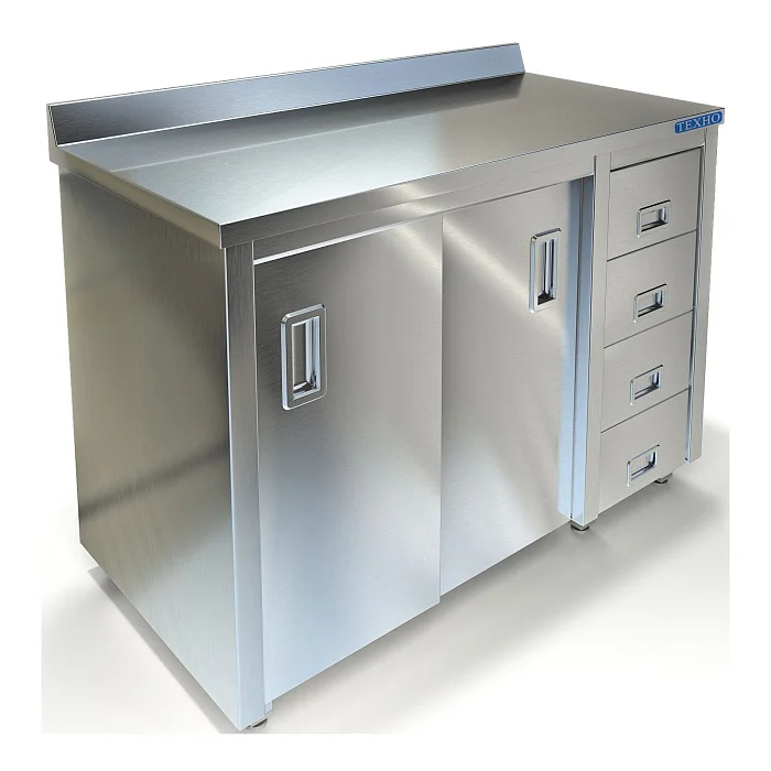 Модель отличается особой практичностью: высокий борт по краю столешницы предотвращает соскальзывание продуктов, а раздвижные двери-купе экономят пространство даже в самой компактной кухне. Все элементы выполнены из качественной нержавеющей стали марок AISI 304 и 430, что гарантирует долговечность и гигиеничность.