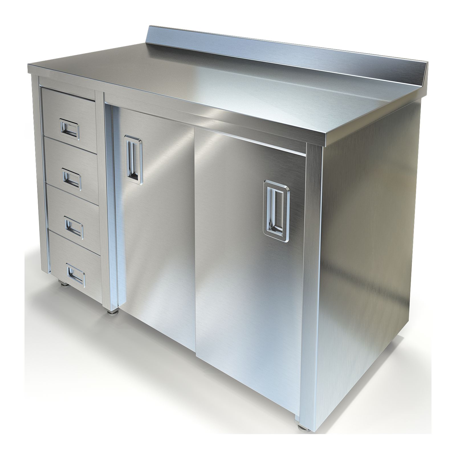 Высокий борт по краю не даст продуктам скатиться во время готовки. А раздвижные двери-купе открываются легко и бесшумно, не занимая лишнего пространства — это особенно ценно в небольших помещениях.Модель полностью выполнена из прочной нержавеющей стали, устойчивой к влаге и истиранию. Стол приезжает к вам готовым к работе — просто поставьте его в выбранное место и отрегулируйте высоту ножек для идеально ровной установки.