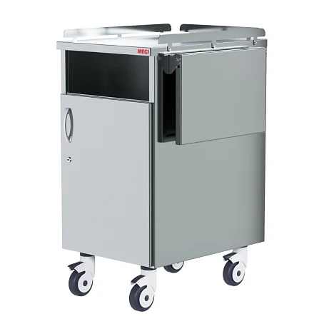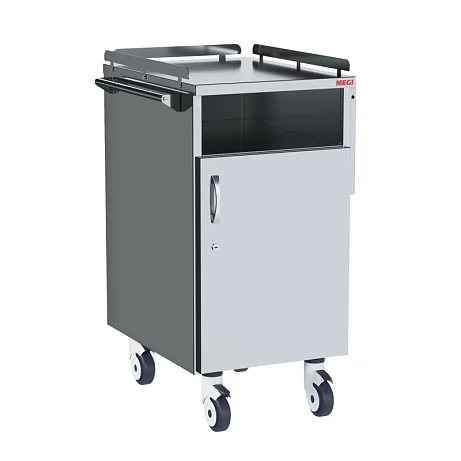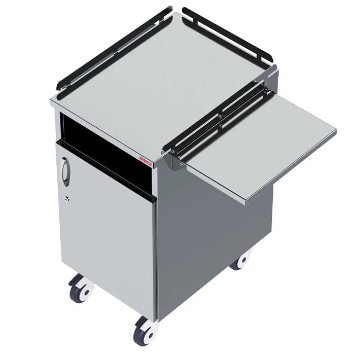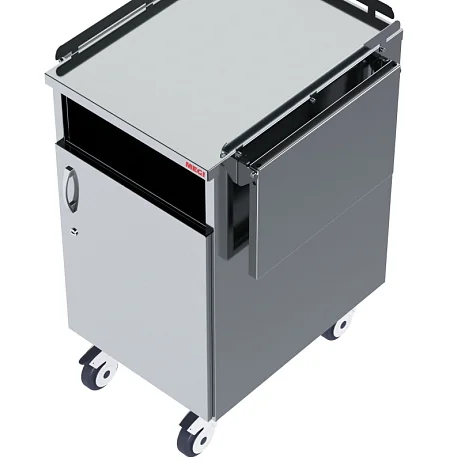 Столик анестезиолога МСК-5565 — это надежный помощник в медицинской среде, созданный для комфортной работы специалистов. Изготовленный из нержавеющей стали толщиной 0,8 мм, он легко поддается обработке всеми видами медицинских дезинфицирующих и моющих растворов, что обеспечивает высокую степень гигиеничности. Столешница с бортиками по трём сторонам предотвращает случайное падение инструментов и материалов. Столик оснащён вместительной нишей и одной распашной дверкой, за которой располагается удобно организованная полка для хранения расходных материалов. Его самоориентирующиеся колеса диаметром 100 мм из серой резины, два из которых имеют автономное тормозное устройство, обеспечивают легкость перемещения и устойчивость на месте. Благодаря боковой ручке, столик легко транспортировать, что делает его идеальным для использования в хирургических и анестезиологических отделениях.