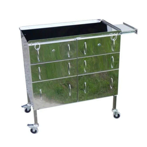Оснащен столешницей с отбортовкой высотой 16 мм, столик обеспечивает безопасное размещение медицинских инструментов. Под столешницей расположена удобная выдвижная полка с ручкой и шесть ящиков на направляющих полного выдвижения, два из которых снабжены замком для защищенного хранения важных материалов. Дополнительно, столик имеет ручку для легкого перемещения, что делает его идеальным выбором для использования в условиях перевязочных отделений. Качественные материалы и продуманный дизайн обеспечивают функциональность и надежность в работе.