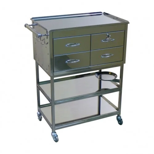 В нижней части расположены четыре ящика на направляющих полного выдвижения, один из которых снабжён замком для безопасного хранения медицинских материалов. Выдвижная полка с ручкой обеспечивает удобный доступ к необходимым принадлежностям. Под ящиками находятся две полки с отбортовкой по 16 мм, что увеличивает объём для хранения. Также на правой передней стойке имеется поворотная тарелка для расходных материалов, а с левой стороны предусмотрена ручка для перемещения и три крючка для крепления инструментов. Столик СП-02НН — идеальное решение для эффективной работы в условиях медицинских учреждений, обеспечивая высокий уровень удобства и организация рабочего пространства.