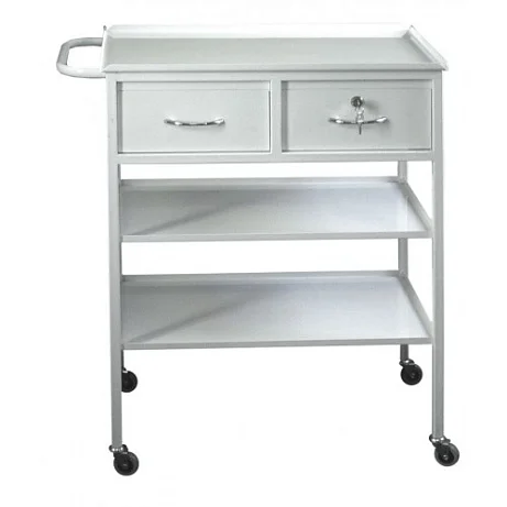 Столик оснащен столешницей с отбортовкой высотой 16 мм, что способствует безопасному размещению медицинских инструментов. Под столешницей находятся два ящика на роликовых направляющих, один из которых оборудован замком для безопасного хранения важных материалов. Также предусмотрены две полки под ящиками для дополнительного хранения. Удобная ручка для перемещения делает столик мобильным и легким в использовании, что идеально подходит для динамичных условий медицинских учреждений.