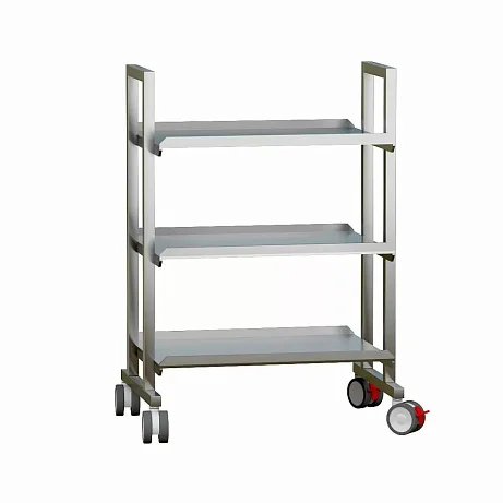 Три полки изготовлены из нержавеющей стали толщиной не менее 1 мм и имеют бортики высотой не менее 20 мм. Это важная деталь для реальной работы: бортик снижает вероятность того, что ампула, лоток, флакон или инструмент соскользнет при перемещении тележки или случайном касании.