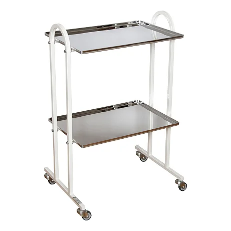 Присутствуют 2 полки, изготовленные из качественной нержавеющей стали. Предусмотрены бортики, расположенные по периметру полок. Они предупреждают падение медикаментов и инструментов. Для удобства перемещения столик дополняется боковыми ручками. Также есть 4 колесных опоры, лишенные тормозов.