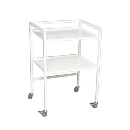 Каркас столика производится из стального, тонкостенного профиля, отличающегося квадратным сечением. Он дополняется полимерно-порошковым покрытием, которое устойчиво к дезинфицирующим средствам. Присутствуют 2 полки из высокопрочного окрашенного металла. Колесные опоры существенно облегчают процесс перемещения столика по помещению.