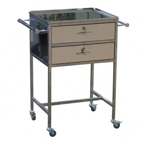 Столешница с двойной отбортовкой высотой 16 мм, выполненная из нержавеющей стали, обеспечивает легкость в уходе и защиту от коррозии. Под столешницей расположены два выдвижных ящика на роликовых направляющих, оснащенные замками и ручками, что позволяет удобно хранить медицинские инструменты и материалы, обеспечивая быстрый доступ к ним. Этот столик идеально подходит для использования в процедурных кабинетах, обеспечивая порядок и эффективность в работе медицинского персонала.