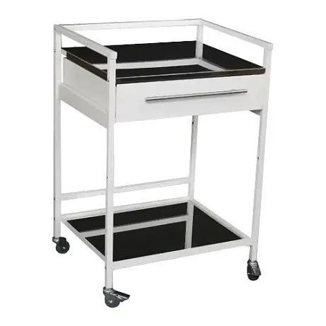 Каркас столика производится из стального, тонкостенного профиля. Все металлические детали обладают качественным полимерно-порошковым покрытием, которое устойчиво к дезинфицирующим веществам. Присутствуют 2 полки из прочной нержавеющей стали. Одна из них вставлена в рамку. Есть ящик из окрашенной стали.