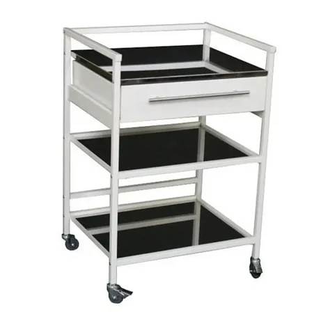 Каркас стола производится из стального, тонкостенного металла, покрытого полимерно-порошковой краской. Данное покрытие не боится коррозийного воздействия и влияния дезинфицирующих средств. Предусмотрены 3 полки и выдвижной ящик, оснащенный механизмом телескопического типа. 4 самоориентирующихся колеса облегчают процесс перемещения мебели.