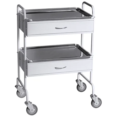 Столик СММН-11 — универсальный помощник для медицинских учреждений, предназначенный для хранения и транспортировки инструментов, перевязочных и медицинских материалов. Оснащен двумя полками из нержавеющей стали и двумя удобными выдвижными ящиками, он гарантирует удобный доступ к необходимому. Прочный каркас из стального профиля с полимерно-порошковым покрытием обеспечивает долговечность и легкость в санитарной обработке.