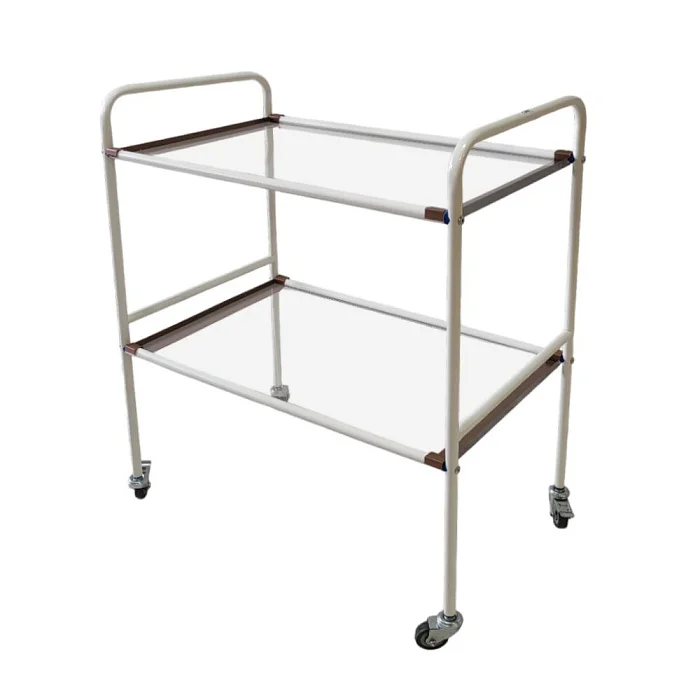 Каркас изготовлен из стальной трубы и покрыт белым полимерным слоем. Такое покрытие хорошо подходит для медицинских помещений: поверхность выглядит опрятно, проще переносит ежедневные протирки и сохраняет аккуратный вид при интенсивной эксплуатации. Столик установлен на пластиковые мебельные колёса Ø50 мм — это базовый, проверенный формат для перемещения по ровным напольным покрытиям.