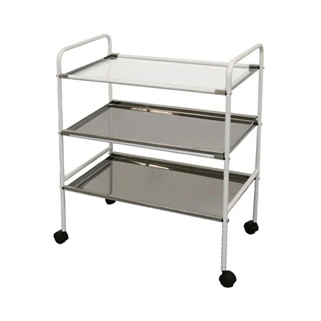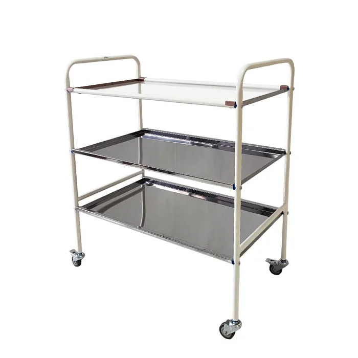 Каркас выполнен из стальной трубы и защищен полимерным покрытием. Такое решение ценят в медучреждениях за устойчивость к типичным нагрузкам и аккуратный внешний вид при длительной эксплуатации. Полки: две — из нержавеющей стали, одна — стеклянная. Нержавейка уверенно переносит регулярную санитарную обработку и контакт с расходными материалами, а стеклянная поверхность удобна тем, что хорошо контролируется визуально и легко приводится в порядок.