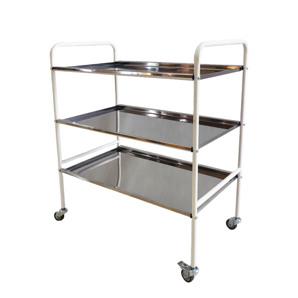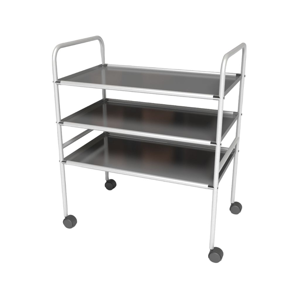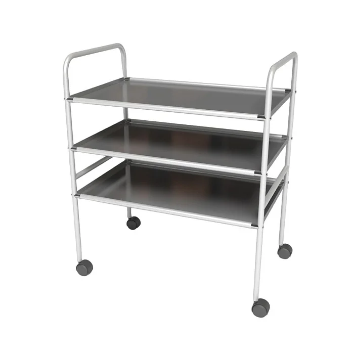 Все три полки изготовлены из нержавеющей стали — это решение ценят там, где столик используется постоянно: поверхность устойчива к регулярной санитарной обработке и не «боится» типичных медицинских сред. По периметру предусмотрен бортик, который помогает удерживать лотки, флаконы и упаковки при манёврах и разворотах.