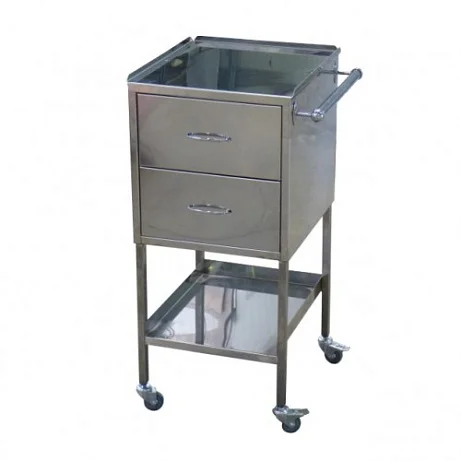 Столешница с двойной отбортовкой высотой 16 мм обеспечивает дополнительную защиту и удобство в использовании. Под ней расположены два выдвижных ящика на роликовых направляющих, обеспечивающие легкий доступ к медицинским инструментам и материалам. Также предусмотрена полка с отбортовкой высотой 41 мм для хранения дополнительных принадлежностей. Для удобства перемещения столика на левой стороне имеется ручка. Данный столик идеально подходит для процедурных кабинетов, обеспечивая порядок и эффективность в работе медицинского персонала.