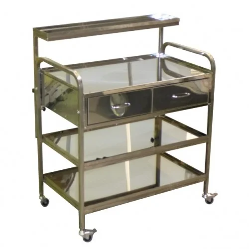 Столешница столика выполнена с двойной отбортовкой высотой 16 мм, что гарантирует безопасность и предотвращает соскальзывание инструментов. Столик оснащен двумя ящиками на направляющих полного выдвижения, позволяющими легко и удобно получать доступ к медицинским принадлежностям. Под ящиками расположены две полки с отбортовкой 20 мм, обеспечивающие дополнительное место для хранения.