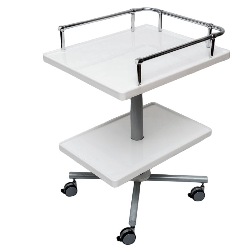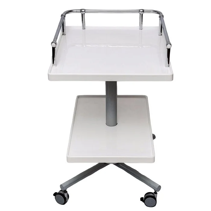 В качестве каркаса выступает единая центральная ножка из стали, покрытая порошковой краской. Мебель обладает полкой и столешницей из акрилового гипоаллергенного легкодезинфицируемого пластика. В основании находятся 4 самоориентирующихся резиновых колеса. Все колеса оснащаются тормозными механизмами. Конструкция стола является неразборной.