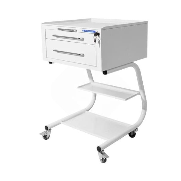 Основу столика составляет металлическая конструкция из круглой трубы и тонколистовой стали с полимерно-порошковым покрытием белого цвета. Такое покрытие выбирают за стойкость к мелким царапинам, аккуратный внешний вид и простоту ухода в условиях кабинета. Корпус компактный, но вместительный: основные рабочие зоны разделены по уровням, поэтому столик не перегружается визуально и остается удобным в работе.