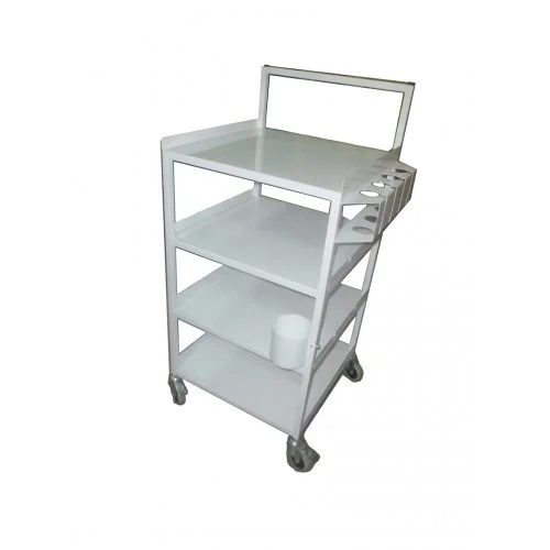Столик-тележка для аппарата УЗИ представляет собой функциональное и удобное решение для медицинских работников. Его надежная конструкция включает каркас и четыре металлические полки с отбортовкой высотой 31 мм, что обеспечивает дополнительную защиту и стабильность при использовании. На уровне верхней полки расположены специальные приспособления для хранения четырех датчиков, что позволяет держать их всегда под рукой. Между второй и третьей полками находится пластиковый стакан цилиндрической формы для флакона с гелем, надежно закрепленный в металлическом кронштейне. Этот столик-тележка оптимизирует процесс работы с аппаратом УЗИ, обеспечивая удобный доступ ко всем необходимым инструментам и материалам.
